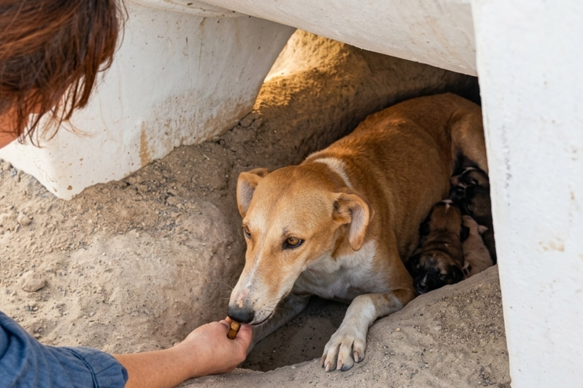 Al llegar al lugar, los rescatistas notaron que Sandy no estaba sola: la perra permaneció oculta dentro de la cavidad que ella misma realizó en la arena y piedras. Su objetivo fue claro desde el primer momento: proteger a sus cachorros del sol inclemente y del peligro que representaba el abandono.